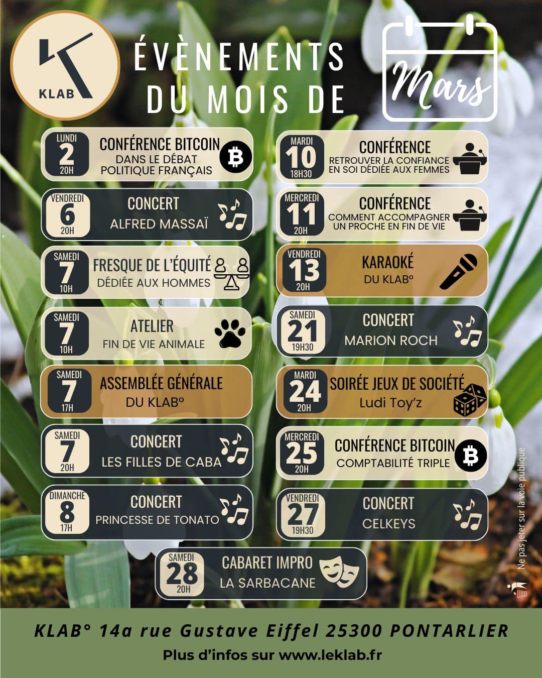 TIERS-LIEU PONTARLIER LE KLAB° Adhérer au KLAB° Consulter l'agenda Découvrir nos espaces Proposer un projet Adhérerau KLAB° Consulterl'agenda Découvrirnos espaces Proposerun projet France 3 est venu à notre rencontreDans ce reportage apparait la vie du KLABQuels sont ses acteurs, ses occupants ?Quelles sont ses activités ?Comment participer à l’aventure ? A venir Marion Roch en concert le 21 Mars 2026 Reportage france3 Découvrir le Klab ! Programme culturel MARS 2026 Découvrir les actualités BESOIN D'UN BUREAU OU D'UNE SALLE ? Découvrir nos espaces en location Découvrir nos espaces Envie de contribuer à la vie du lieu ? Découvrir nos activités Poser une question Profiter d'un atelier ou D'un événement Participer à un événement Proposer un évènement Consulter l'agenda Vous pouvez adhérer ici au Klab° comme au Klub° Plongez dans une aventure humaine riche en partages et en rencontres. Adhérer avec HelloAsso CLUB PRIVE Le KLUB° RÉSEAU TRANSFRONTALIER CULTUREL & ENTREPRENEURIAL Le KLUB est un groupe d’entrepreneurs qui a pour but de tisser des liens au sein du territoire et s’entraider. 14 Rue Gustave Eiffel 25 300 Pontarlier contact@leklab.fr 03 81 89 75 22 Nos partenaires institutionnels Merci pour le soutien que vous apportez au KLAB° Pages À propos Acteurs Actualités Agenda Atelier Yoga Compte Connexion Contact Devenir bénévole Porteur de projet Déconnexion Espaces Kafe Kalipso Kanopée Kiosque Kokon Komete Konstellation Kortex Kosmos Kreative room La Fabrik Le Kollectif Première réservation Events F.A.Q Blog le KLAB° Membres Mentions légales Politique de confidentialité Règlement intérieur Réinitialisation du mot de passe S’inscrire Tiers-lieux Utilisateur/utilisatrice